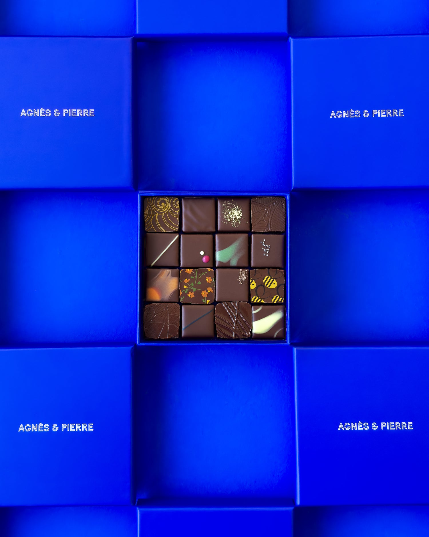 Ce coffret est composé d'un assortiment de 16 chocolats noirs ganache différents.
